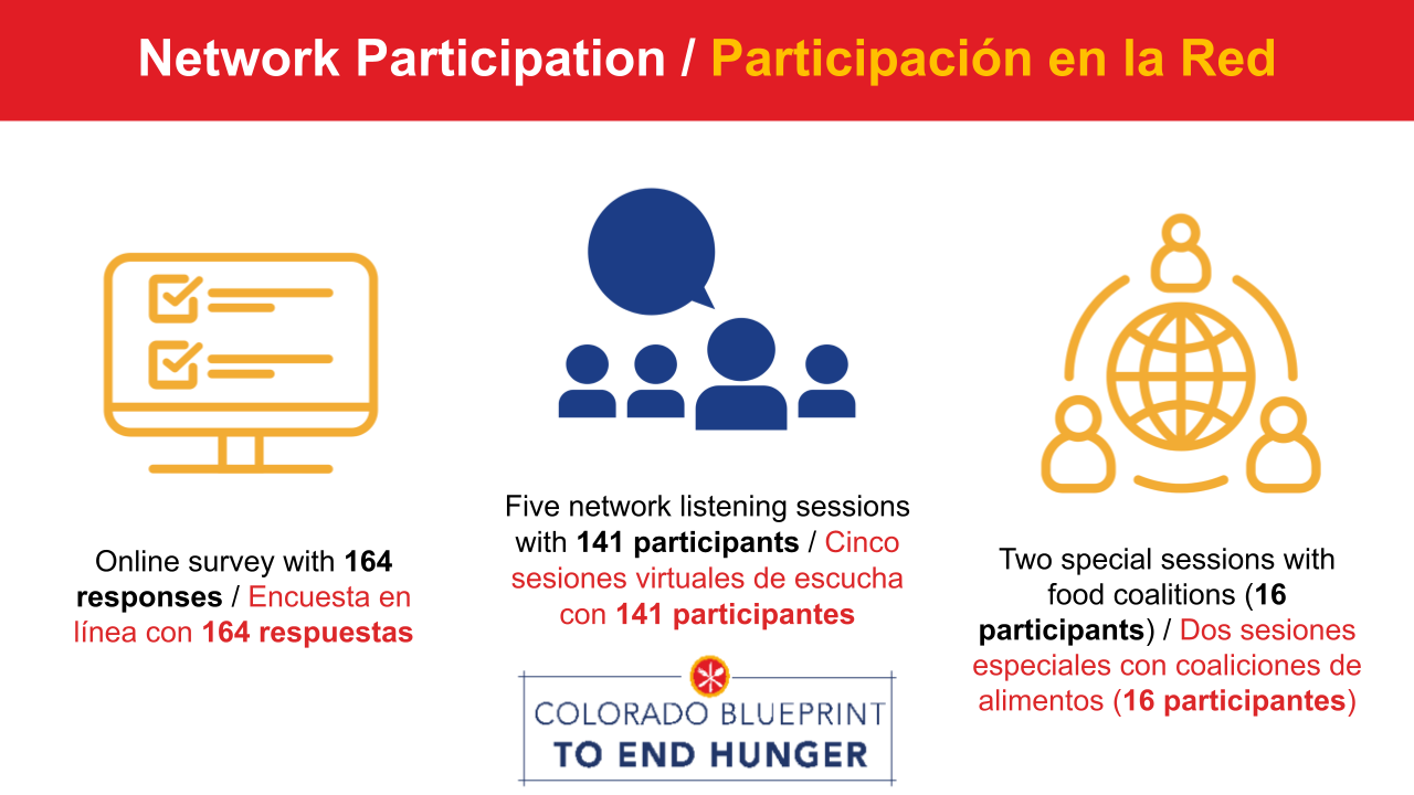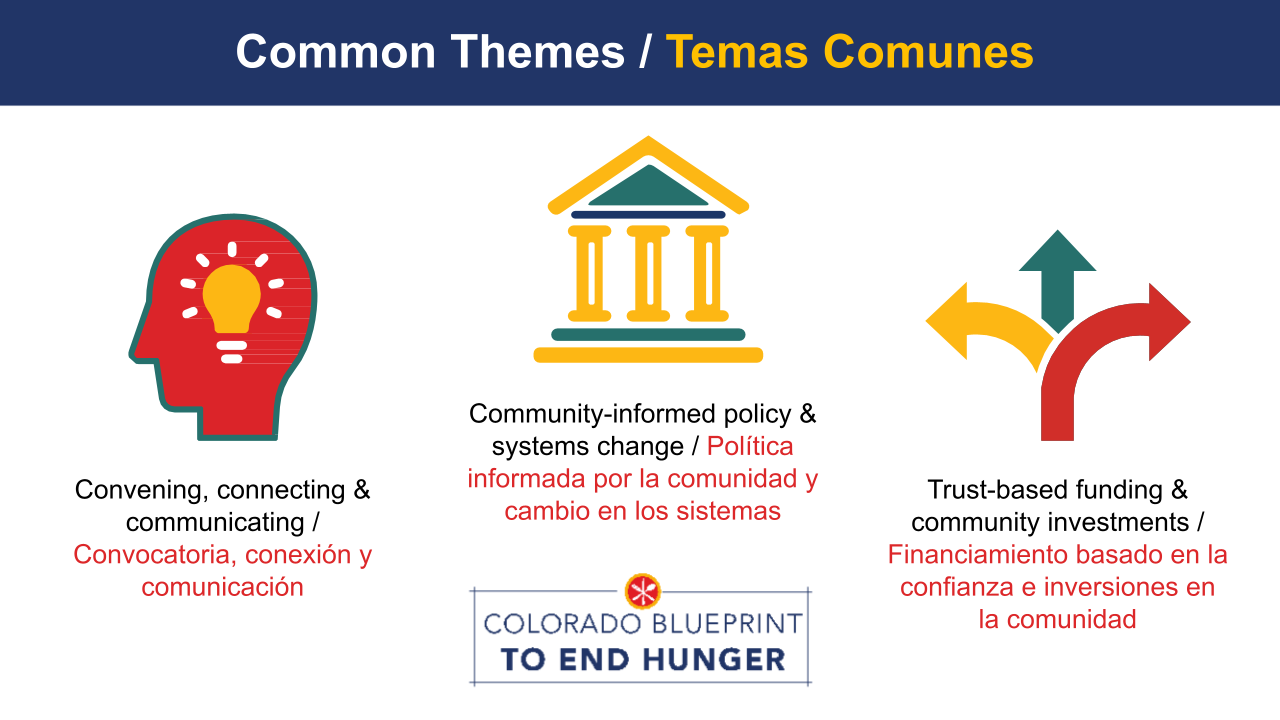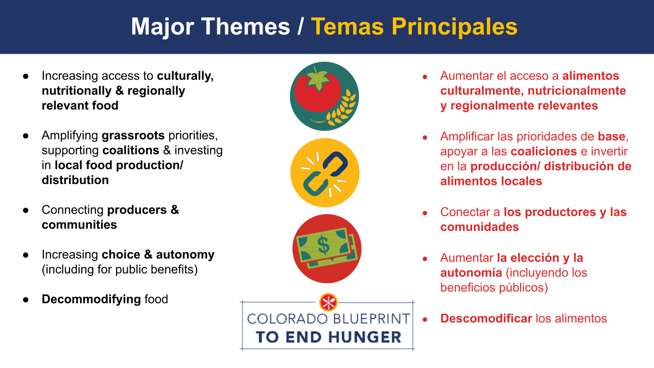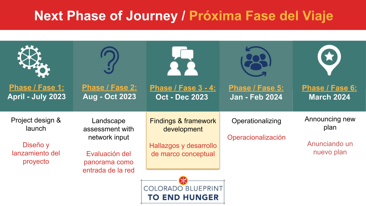 Recientemente concluimos la segunda fase del proceso de transformación y planificación estratégica de un año del Plan de Colorado para Acabar con el Hambre (El Blueprint), donde recopilamos aportes de nuestra comunidad de socios en la red. ¡Un gran agradecimiento a todos los que tomaron el tiempo para compartir sus ideas sobre El Blueprint y cómo puede evolucionar para servir mejor a nuestras comunidades de Colorado!